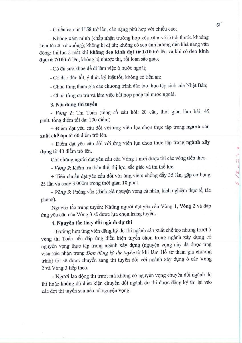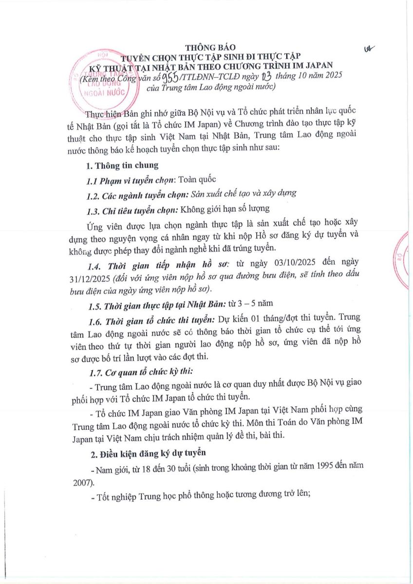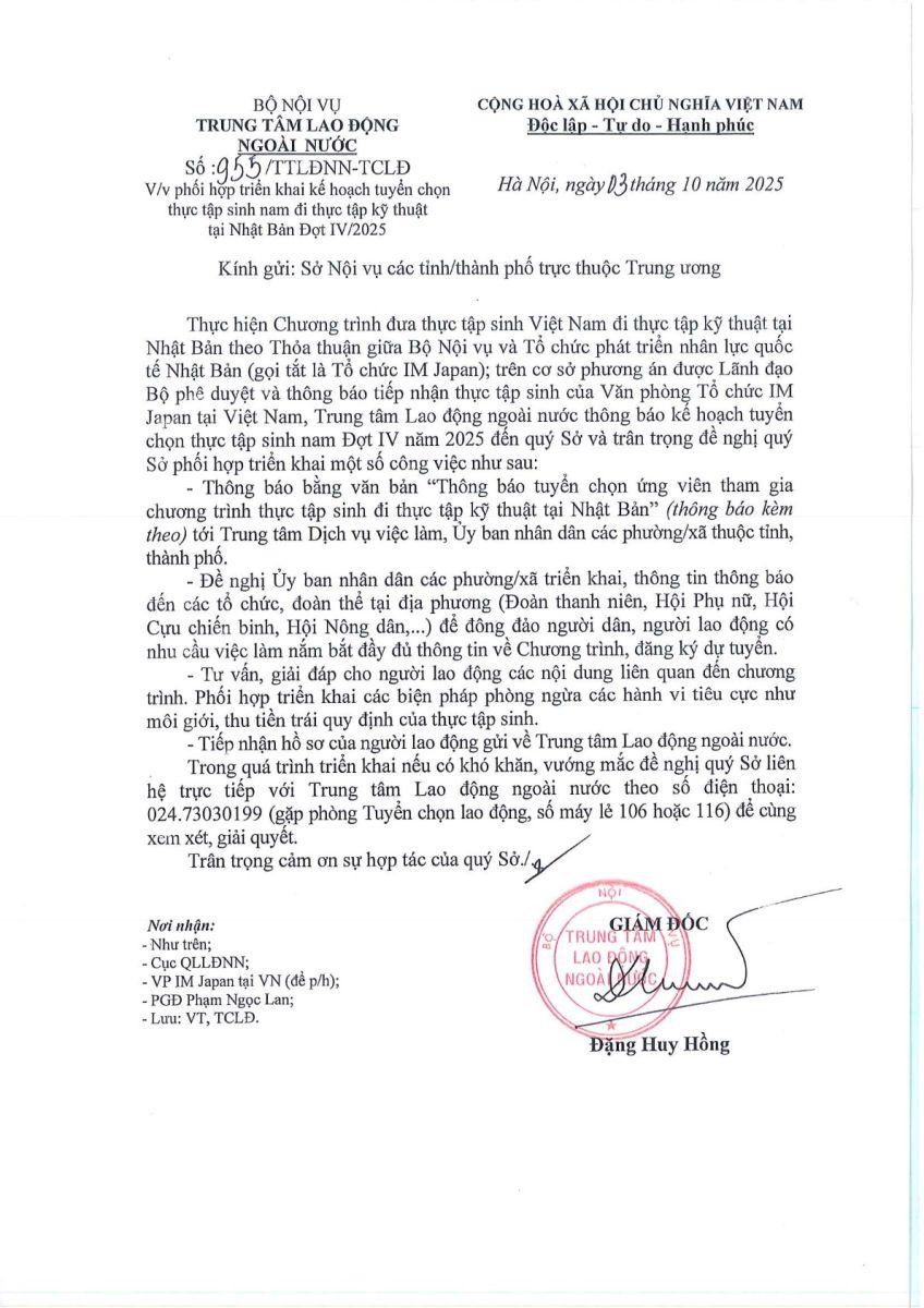 THÔNG BÁO KẾ HOẠCH TUYỂN CHỌN THỰC TẬP SINH NAM ĐI THỰC TẬP KỸ THUẬT TẠI NHẬT BẢN ĐỢT IV/2025