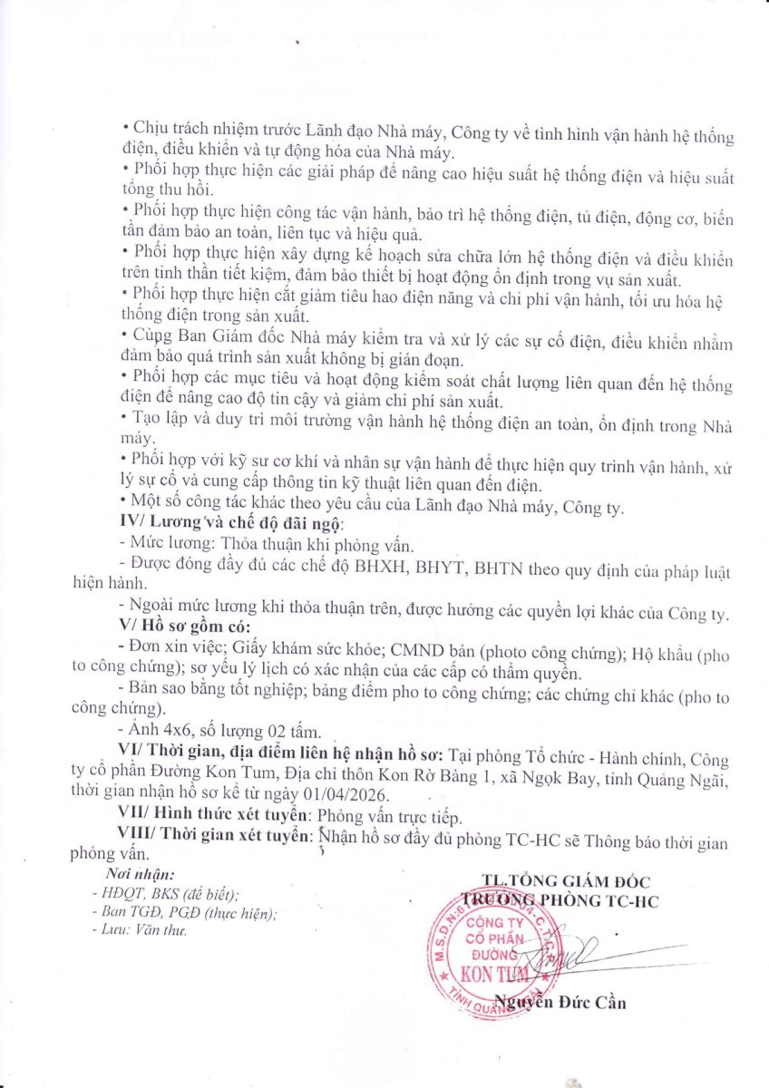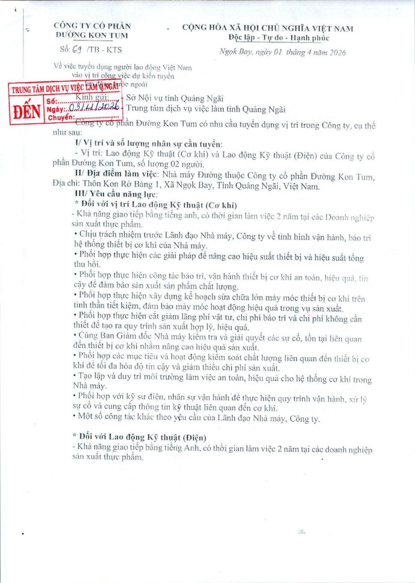 THÔNG BÁO TUYỂN DỤNG NGƯỜI LAO ĐỘNG VIỆT NAM VÀO VỊ TRÍ CÔNG VIỆC DỰ KIẾN TUYỂN NGƯỜI LAO ĐỘNG NƯỚC NGOÀI ( CÔNG TY CP ĐƯỜNG KON TUM )