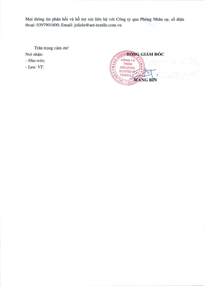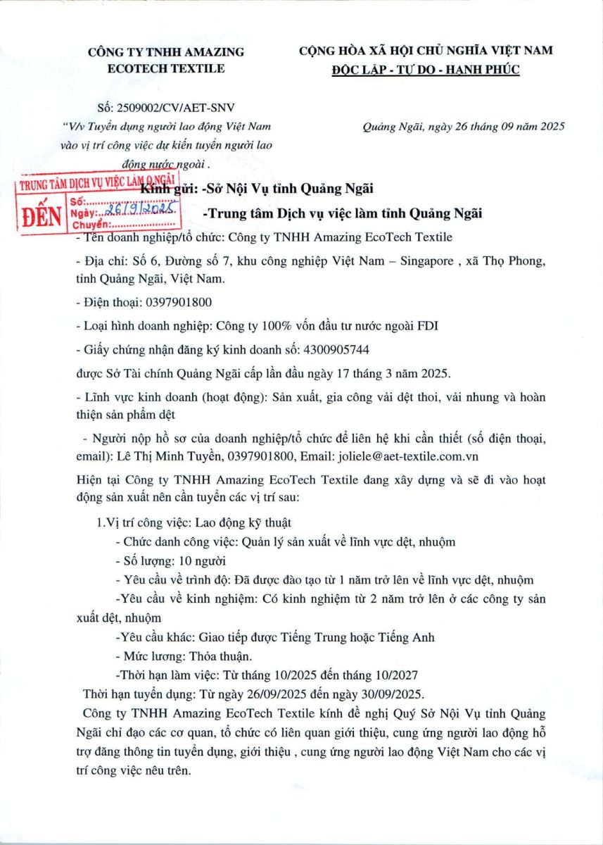 THÔNG BÁO TUYỂN DỤNG NGƯỜI LAO ĐỘNG VIỆT NAM VÀO VỊ TRÍ CÔNG VIỆC DỰ KIẾN TUYỂN NGƯỜI LAO ĐỘNG NƯỚC NGOÀI ( CÔNG TY TNHH AMAZING ECOTECH TEXTILE )