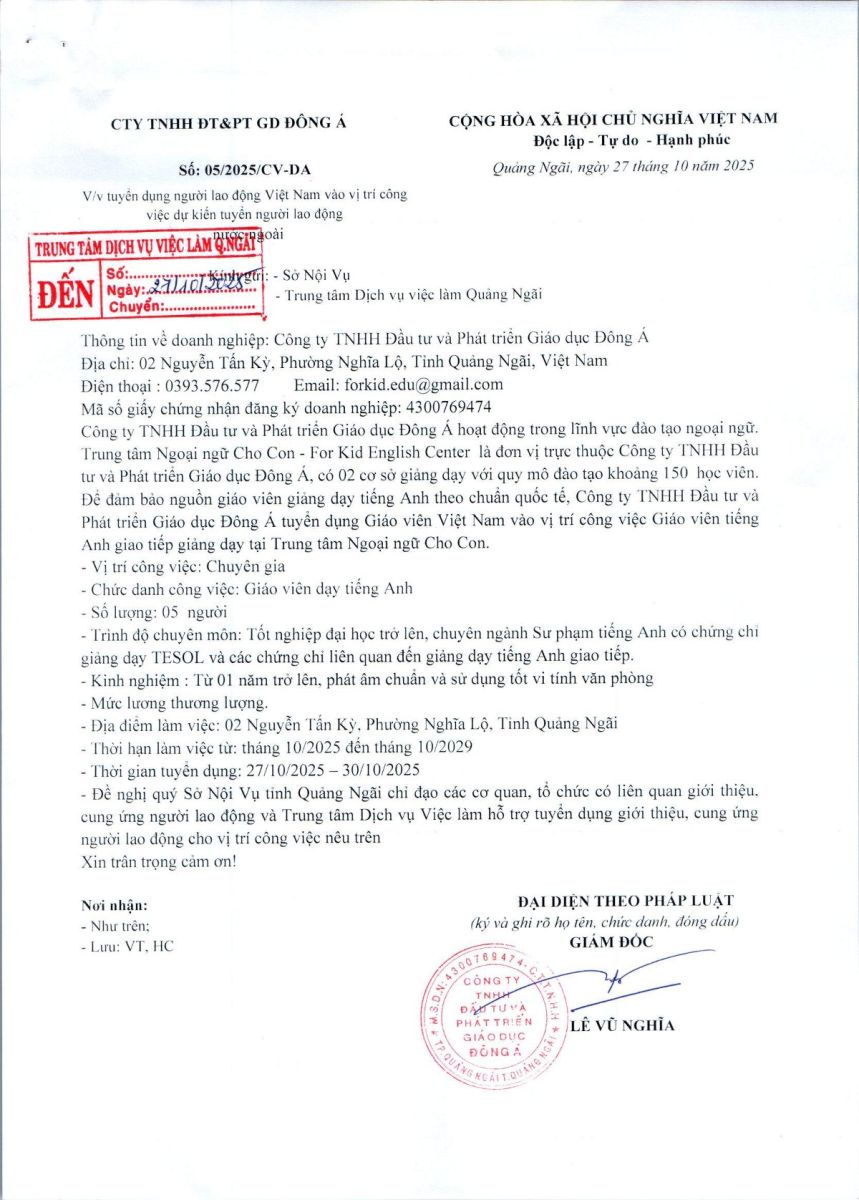 THÔNG BÁO TUYỂN DỤNG NGƯỜI LAO ĐỘNG VIỆT NAM VÀO VỊ TRÍ CÔNG VIỆC DỰ KIẾN TUYỂN NGƯỜI LAO ĐỘNG NƯỚC NGOÀI ( CÔNG TY TNHH ĐẦU TƯ VÀ PHÁT TRIỂN GIÁO DỤC ĐÔNG Á )
