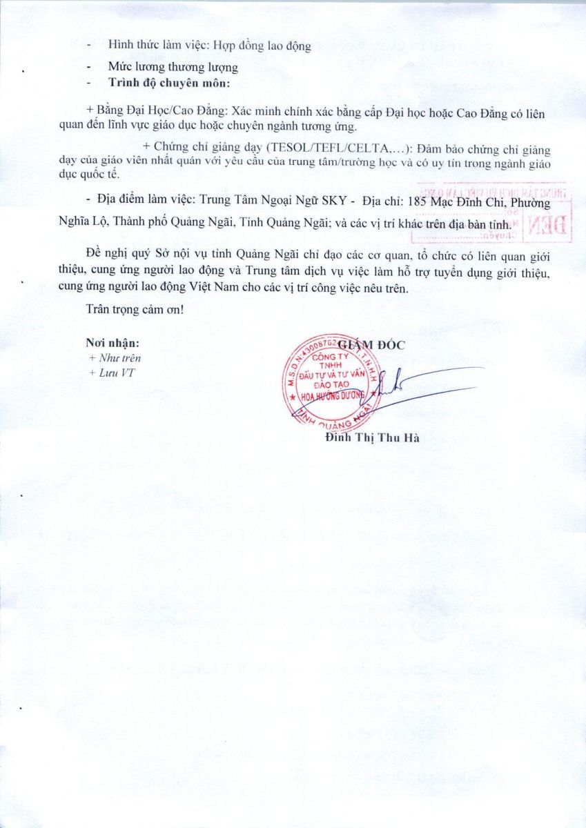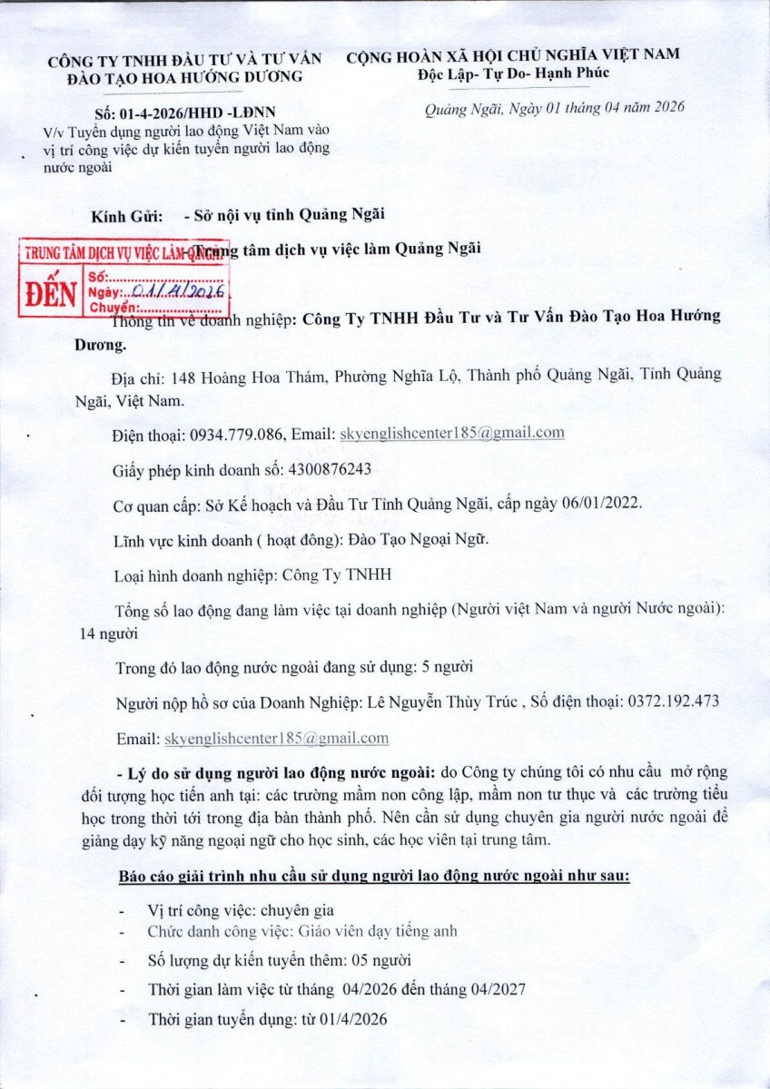 THÔNG BÁO TUYỂN DỤNG NGƯỜI LAO ĐỘNG VIỆT NAM VÀO VỊ TRÍ CÔNG VIỆC DỰ KIẾN TUYỂN NGƯỜI LAO ĐỘNG NƯỚC NGOÀI ( CÔNG TY TNHH ĐẦU TƯ VÀ TƯ VẤN ĐÀO TẠO HOA HƯỚNG DƯƠNG )
