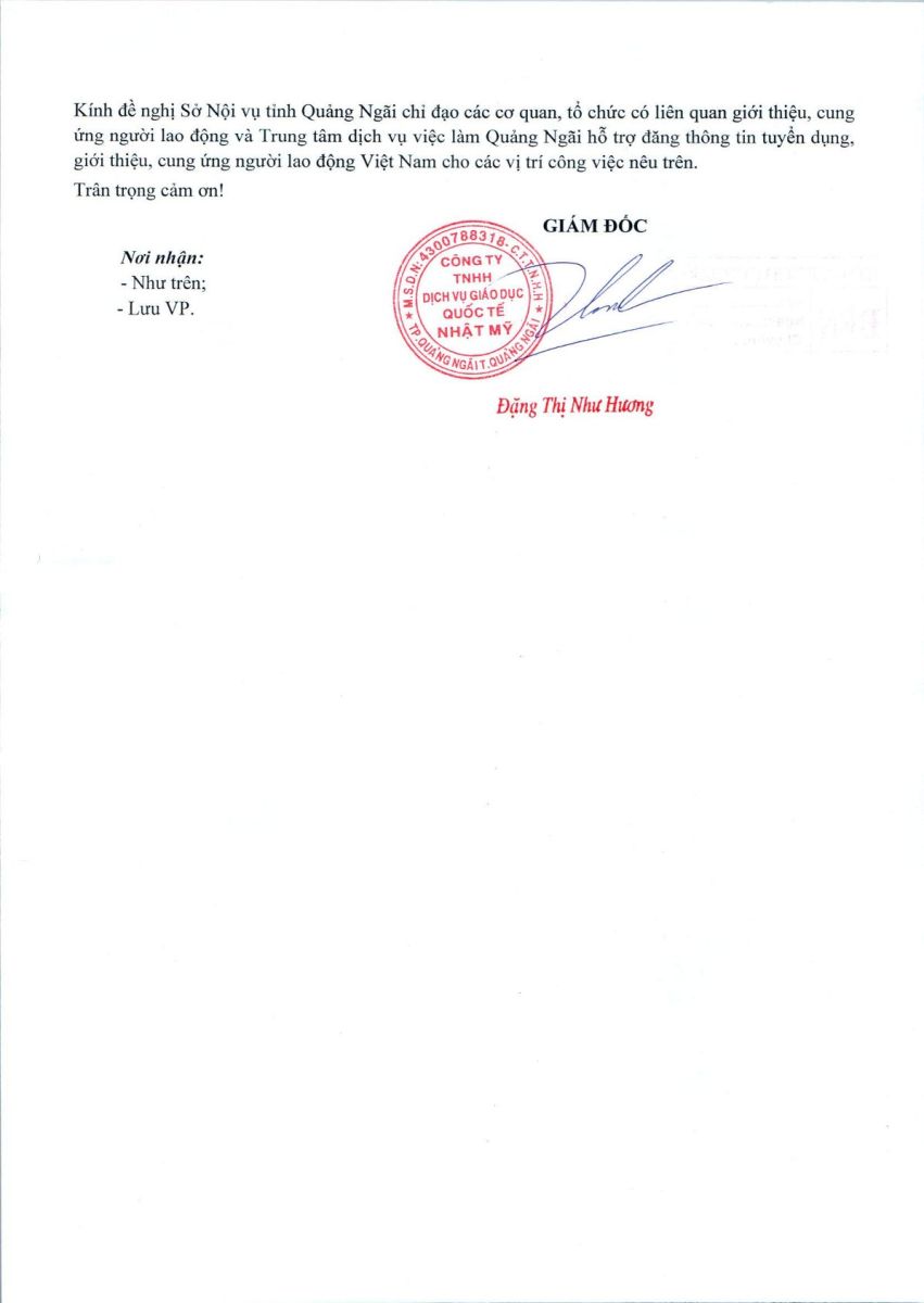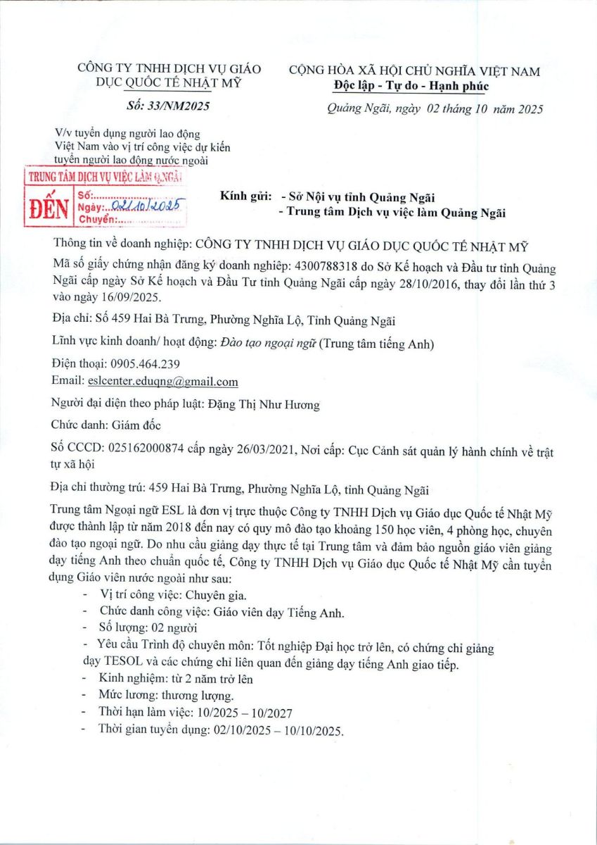 THÔNG BÁO TUYỂN DỤNG NGƯỜI LAO ĐỘNG VIỆT NAM VÀO VỊ TRÍ CÔNG VIỆC DỰ KIẾN TUYỂN NGƯỜI LAO ĐỘNG NƯỚC NGOÀI ( CÔNG TY TNHH DỊCH VỤ GIÁO DỤC QUỐC TẾ NHẬT MỸ )