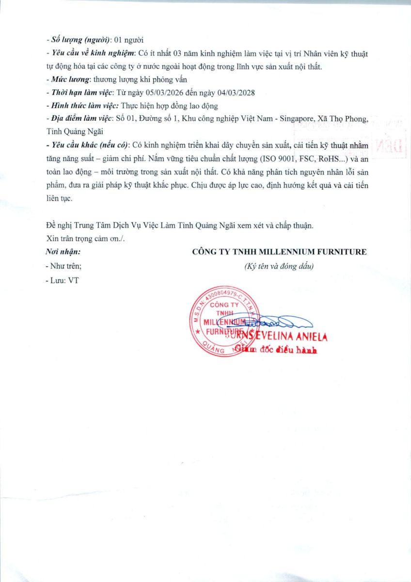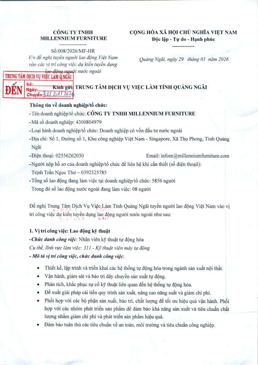 THÔNG BÁO TUYỂN DỤNG NGƯỜI LAO ĐỘNG VIỆT NAM VÀO VỊ TRÍ CÔNG VIỆC DỰ KIẾN TUYỂN NGƯỜI LAO ĐỘNG NƯỚC NGOÀI ( CÔNG TY TNHH MILLENNIUM FURNITURE )