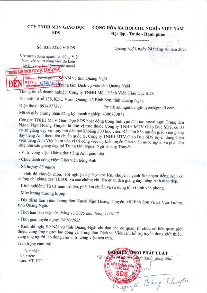 THÔNG BÁO TUYỂN DỤNG NGƯỜI LAO ĐỘNG VIỆT NAM VÀO VỊ TRÍ CÔNG VIỆC DỰ KIẾN TUYỂN NGƯỜI LAO ĐỘNG NƯỚC NGOÀI ( CÔNG TY TNHH MTV GIÁO DỤC SDS )