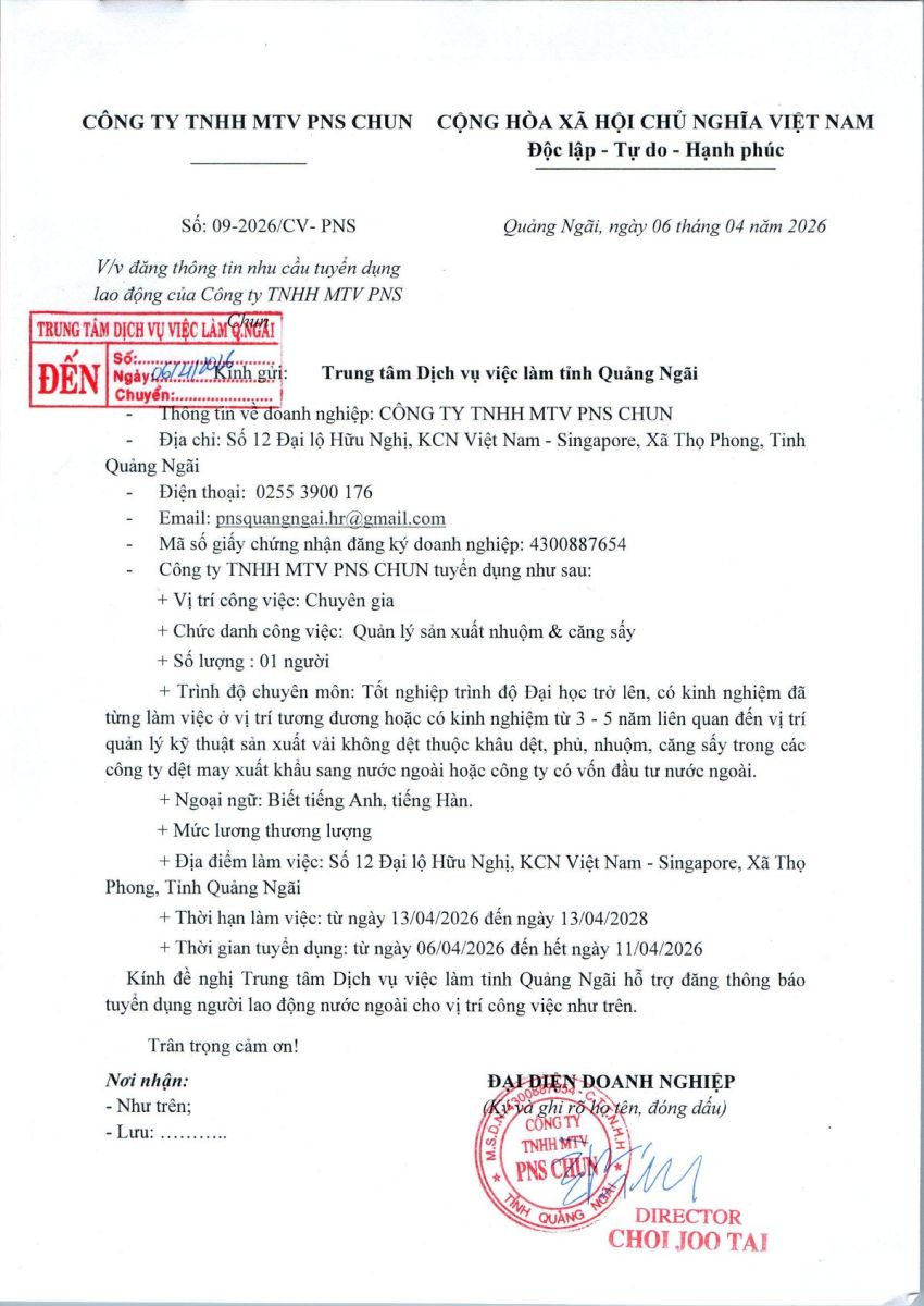 THÔNG BÁO TUYỂN DỤNG NGƯỜI LAO ĐỘNG VIỆT NAM VÀO VỊ TRÍ CÔNG VIỆC DỰ KIẾN TUYỂN NGƯỜI LAO ĐỘNG NƯỚC NGOÀI ( CÔNG TY TNHH MTV PNS CHUN )