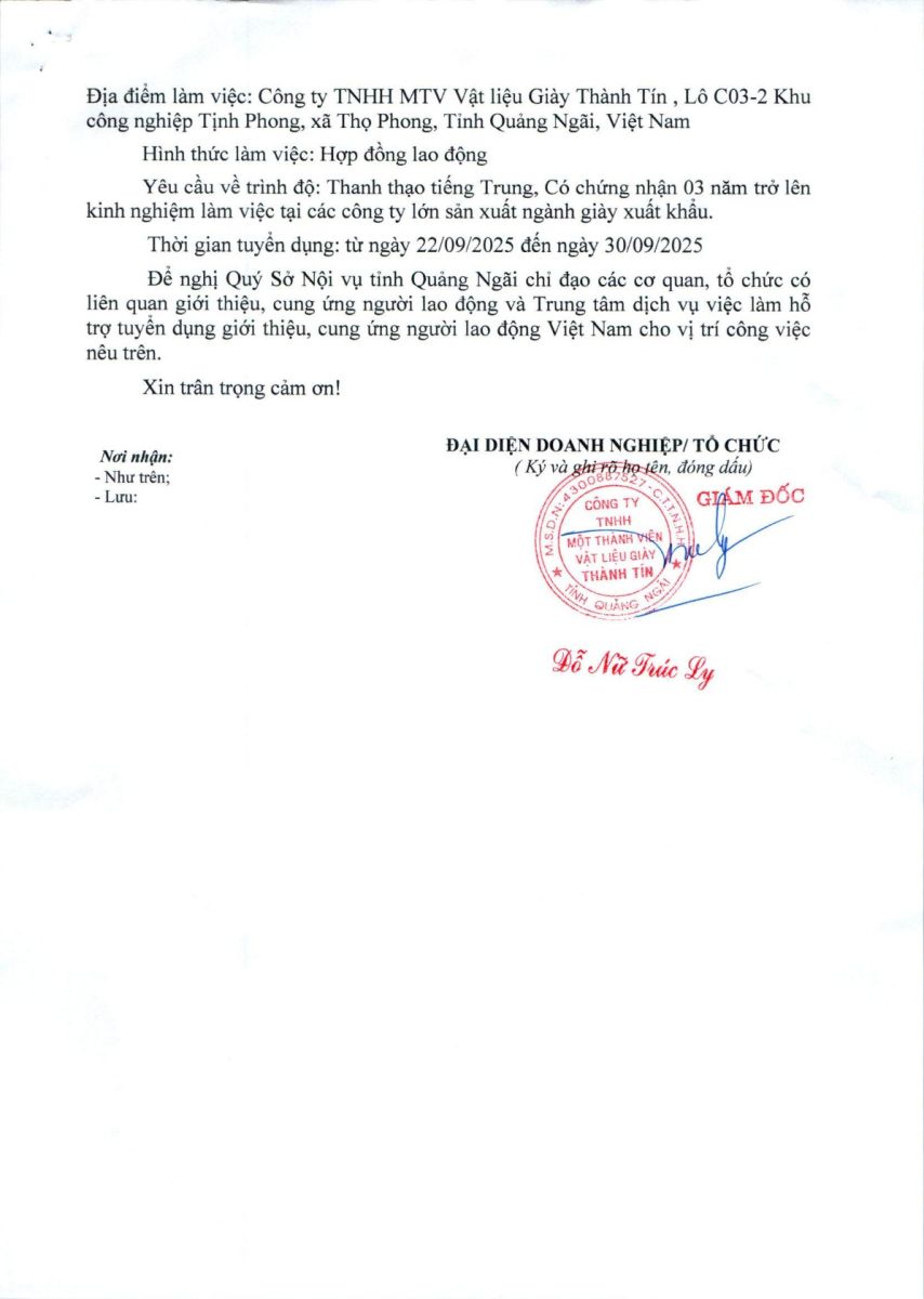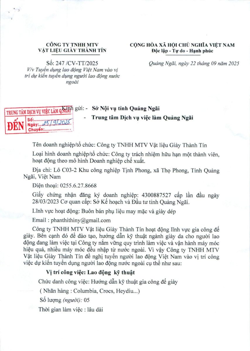 THÔNG BÁO TUYỂN DỤNG NGƯỜI LAO ĐỘNG VIỆT NAM VÀO VỊ TRÍ CÔNG VIỆC DỰ KIẾN TUYỂN NGƯỜI LAO ĐỘNG NƯỚC NGOÀI ( CÔNG TY TNHH MTV VẬT LIỆU GIÀY THÀNH TÍN )