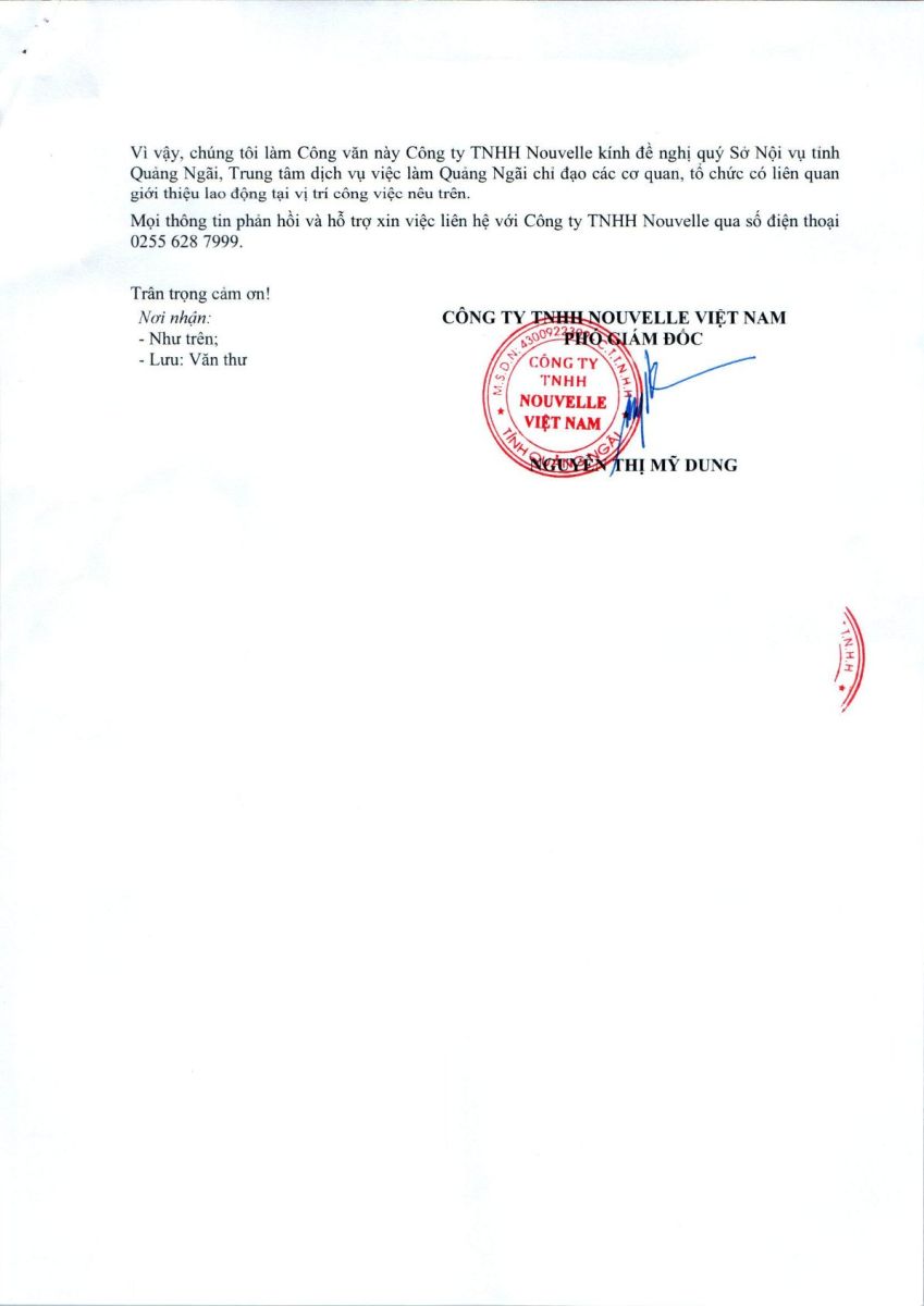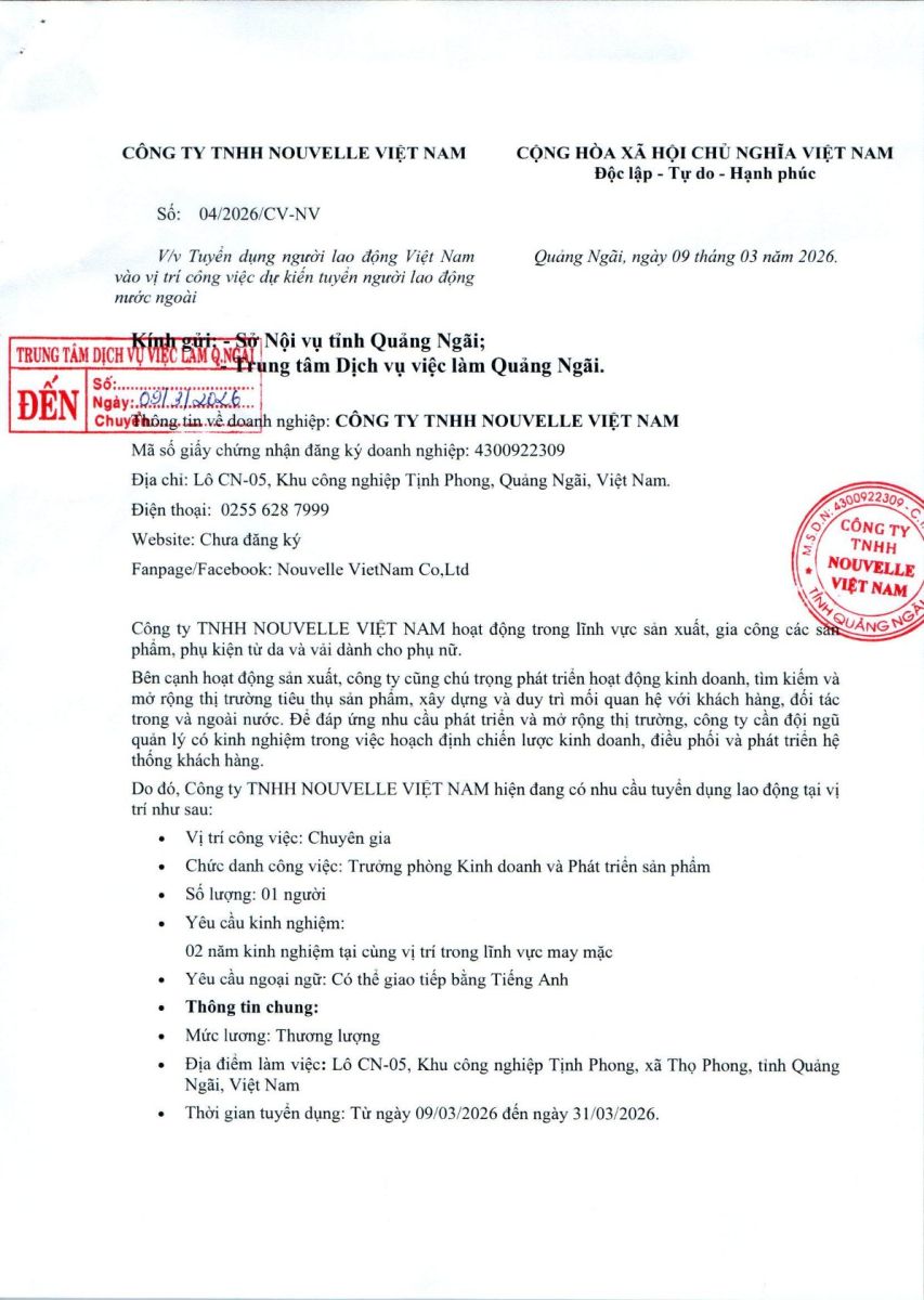 THÔNG BÁO TUYỂN DỤNG NGƯỜI LAO ĐỘNG VIỆT NAM VÀO VỊ TRÍ CÔNG VIỆC DỰ KIẾN TUYỂN NGƯỜI LAO ĐỘNG NƯỚC NGOÀI ( CÔNG TY TNHH NOUVELLE VIỆT NAM )