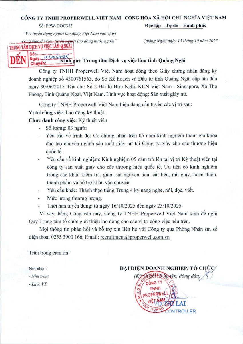 THÔNG BÁO TUYỂN DỤNG NGƯỜI LAO ĐỘNG VIỆT NAM VÀO VỊ TRÍ CÔNG VIỆC DỰ KIẾN TUYỂN NGƯỜI LAO ĐỘNG NƯỚC NGOÀI ( CÔNG TY TNHH PROPERWELL VIỆT NAM )