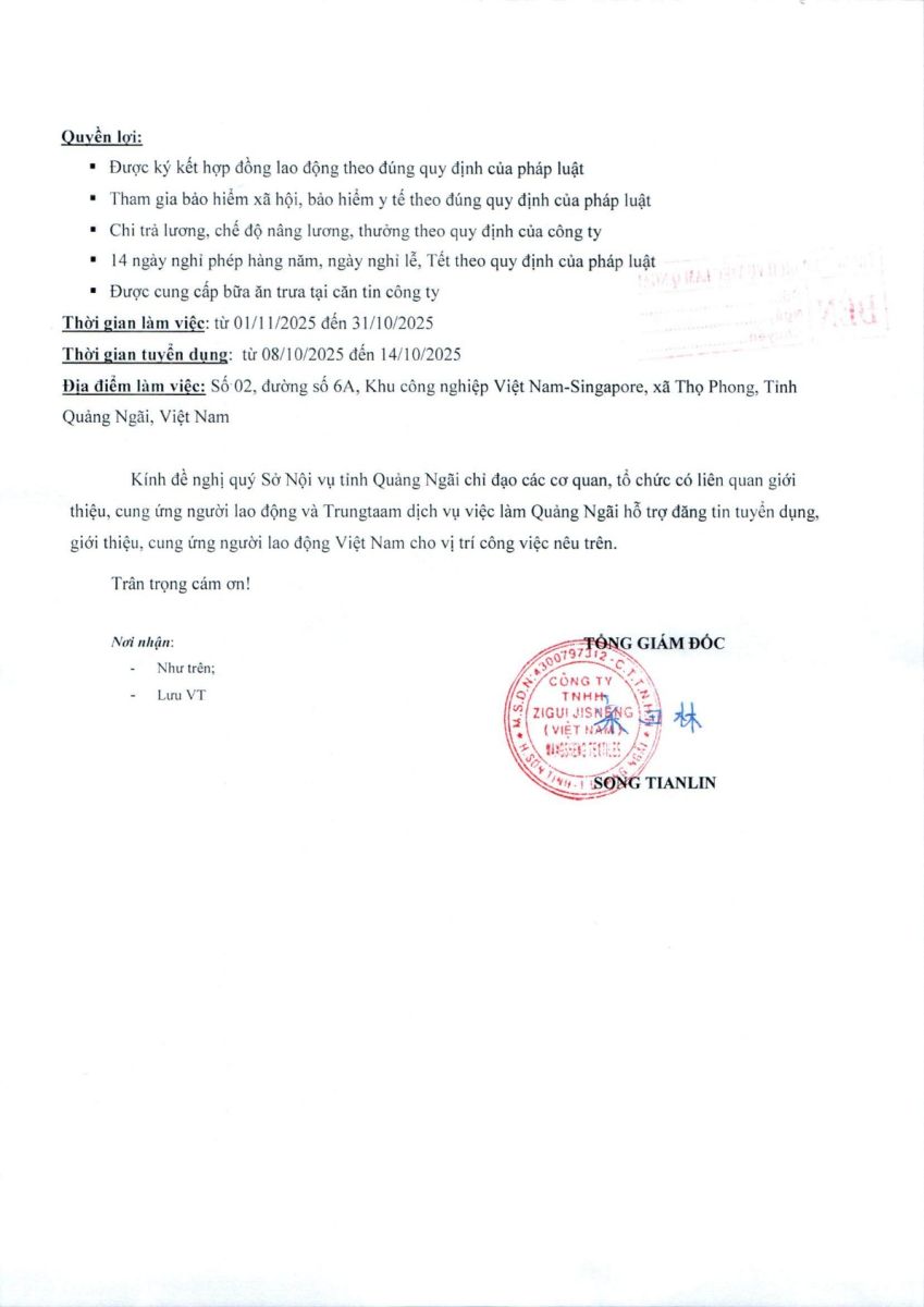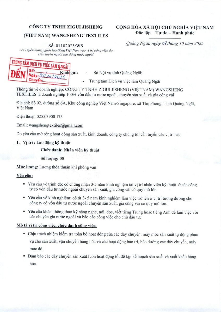 THÔNG BÁO TUYỂN DỤNG NGƯỜI LAO ĐỘNG VIỆT NAM VÀO VỊ TRÍ CÔNG VIỆC DỰ KIẾN TUYỂN NGƯỜI LAO ĐỘNG NƯỚC NGOÀI ( CÔNG TY TNHH ZIGUI JISHENG (VIET NAM) WANGSHENG TEXTILES )