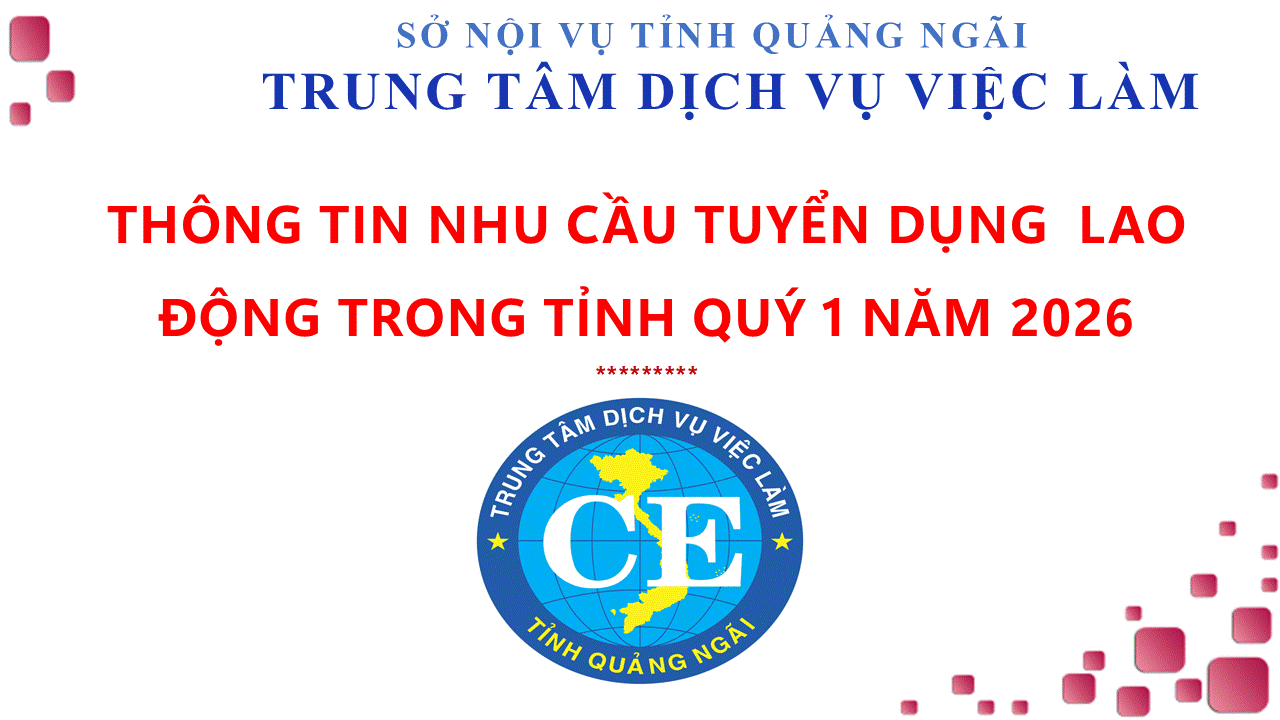 THÔNG TIN TUYỂN DỤNG LAO ĐỘNG TẠI NGÀY HỘI VIỆC LÀM " XUÂN BÍNH NGỌ " NĂM 2026 THƯ MỜI DỰ KHAI MẠC VÀ THAM GIA TUYỂN DỤNG LAO ĐỘNG TẠI NGÀY HỘI VIỆC LÀM "XUÂN BÍNH NGỌ" NĂM 2026. THÔNG BÁO KỲ THI TIẾNG HÀN ĐẶC BIỆT TRÊN MÁY TÍNH DÀNH CHO NGƯỜI LAO ĐỘNG VỀ NƯỚC ĐÚNG HẠN BẢN TIN VỀ LAO ĐỘNG THỜI VỤ TẠI HÀN QUỐC (ĐỢT 1- NĂM 2026) THÔNG TIN TUYỂN DỤNG TẠI " NGÀY HỘI VIỆC LÀM VSIP QUẢNG NGÃI NĂM 2026 THÔNG BÁO DANH SÁCH VIÊN CHỨC, NGƯỜI LAO ĐỘNG LÀM VIỆC TẠI CHI NHÁNH (TÂY QUẢNG NGÃI ) THUỘC TRUNG TÂM DỊCH VỤ VIỆC LÀM TỈNH BẢN TIN VỀ CHƯƠNG TRÌNH LAO ĐỘNG THỜI VỤ TRONG NGÀNH NÔNG NGHIỆP TẠI HÀN QUỐC THÔNG BÁO ĐĂNG KÝ THAM GIA ĐI LÀM VIỆC THỜI VỤ NGÀNH NÔNG NGHIỆP TẠI HÀN QUỐC THÔNG BÁO TUYỂN CHỌN NGƯỜI LAO ĐỘNG ĐI THỰC TẬP KỸ THUẬT TẠI NHẬT BẢN THEO CHƯƠNG TRÌNH IM JAPAN ĐỢT 1 NĂM 2026 THÔNG BÁO TUYỂN DỤNG LAO ĐỘNG BINH ĐOÀN 15 ( BỘ QUỐC PHÒNG )