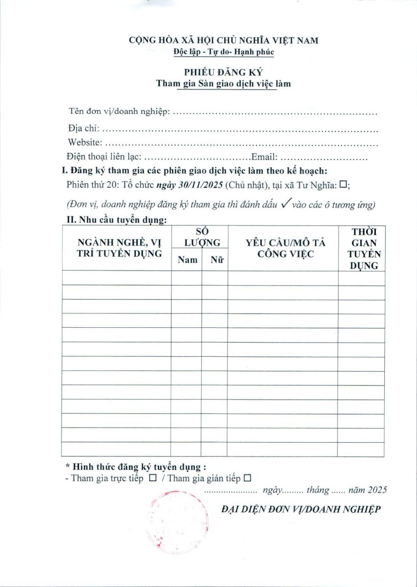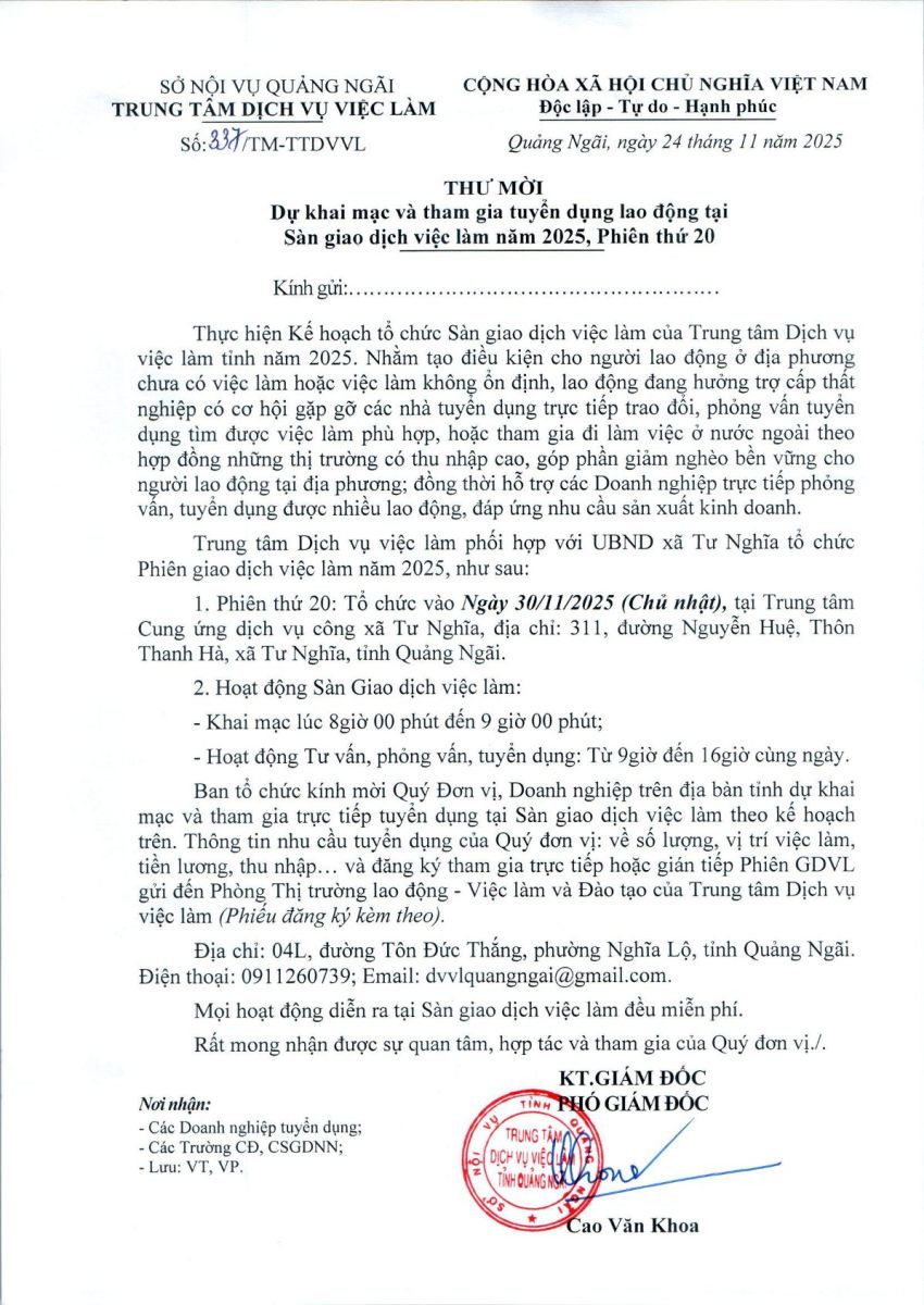 THƯ MỜI THAM GIA DỰ KHAI MẠC VÀ THAM GIA TUYỂN DỤNG LAO ĐỘNG TẠI SÀN GIAO DỊCH VIỆC LÀM NĂM 2025, PHIÊN THỨ 20