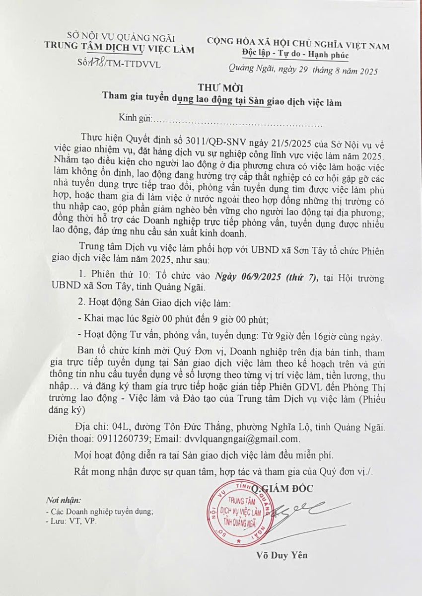 THƯ MỜI THAM GIA TUYỂN DỤNG LAO ĐỘNG TẠI SÀN GIAO DỊCH VIỆC LÀM TỈNH QUẢNG NGÃI NĂM 2025 PHIÊN THỨ 10 (THỨ 7 NGÀY 6/9/2025)