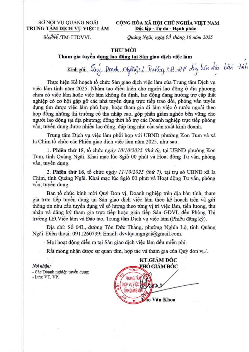 THƯ MỜI THAM GIA TUYỂN DỤNG LAO ĐỘNG TẠI SÀN GIAO DỊCH VIỆC LÀM TỈNH QUẢNG NGÃI NĂM 2025 PHIÊN THỨ 15, 16.