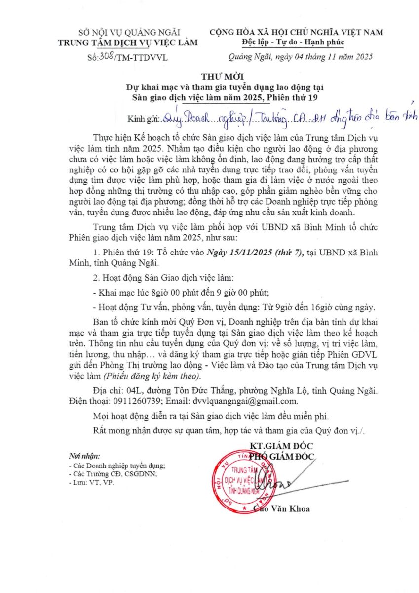 THƯ MỜI THAM GIA TUYỂN DỤNG LAO ĐỘNG TẠI SÀN GIAO DỊCH VIỆC LÀM TỈNH QUẢNG NGÃI NĂM 2025 PHIÊN THỨ 19