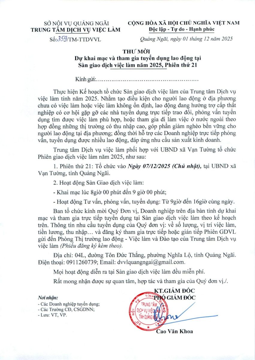 THƯ MỜI THAM GIA TUYỂN DỤNG LAO ĐỘNG TẠI SÀN GIAO DỊCH VIỆC LÀM TỈNH QUẢNG NGÃI NĂM 2025 PHIÊN THỨ 21 Ngày 07/12/2025
