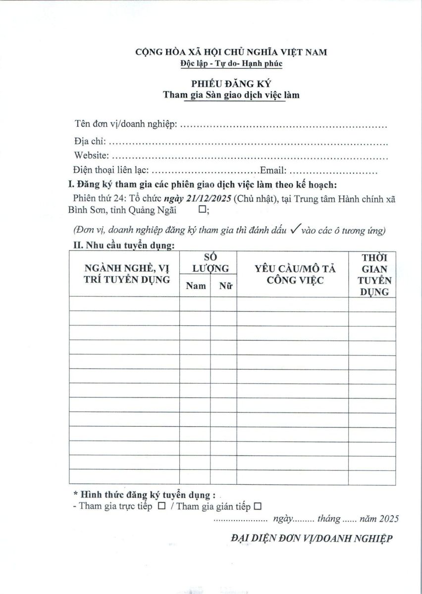 THƯ MỜI THAM GIA TUYỂN DỤNG LAO ĐỘNG TẠI SÀN GIAO DỊCH VIỆC LÀM TỈNH QUẢNG NGÃI NĂM 2025 PHIÊN THỨ 24 TẠI XÃ BÌNH SƠN ( Chủ nhật ngày 21/12/2025)